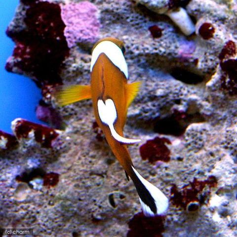 | 種類詳細 | 茶色の体に白い頭部のバンド及び背中の鞍掛け模様が特徴のクマノミで、個体によっては背中から見ると鞍掛け模様が ハートのように見えるものもいます。 自然下ではイボハタゴイソギンチャクと共生していますが、シライト等にも入ることがあります。 雄性先熟型の性転換を行うので小さい個体がオス、大きくなった個体がメスになる性質を持っています。 |