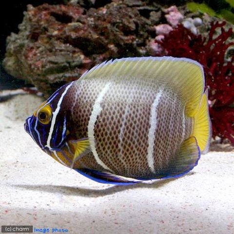 幼魚のうちは他の大型ヤッコ同様青と白の縞模様ですが他の種類に比べて小さいうちから体色の変化が始まります。