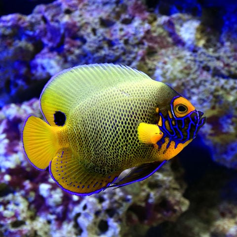 | 種類詳細 | 大型ヤッコでも人気の種類で成魚は黄色と青が入り乱れた、和名が指すとおり艶やかな体色が非常に美しい種類です。 幼魚のうちは他の大型ヤッコ動揺青と白の縞模様ですが、他の種類に比べて小さいうちから体色の変化が始まります。 |