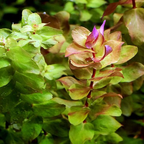 | どんな種類? | 育成難易度 → ★★★☆☆ ミソハギ(Lythraceae)科の植物。ロタラの代表種の一つで、規則正しく密に付ける丸葉とその愛らしさから小型水槽に似合う種です。 環境により葉色が変化し、一定の条件を満たす強酸性下で葉は黄色に染まり、弱酸性で強光下、鉄分の多い環境では新葉の刃先にかけて赤く染まります。 気泡と比較的付けやすい種類で水流で揺らめく姿は非常に美しく、群生させることで魅力を最大限に引き出す事ができます。 60cm水槽で3灯以上、酸性~弱酸性、ソイル、CO2添加あり、液肥主体の施肥で育成しやすいです。 比較的育成は簡単で、ソイルであれば簡単に育てる事ができます。 状態を崩し、光量不足だと下葉を落とす症状が顕著に出ます。直ぐに差し戻しなどは控え、水面近くまでなると盛んに脇目を出し始めます。 その状態で差し戻すと調子を戻す事が出来ます。光量の低下を防ぐため、差し戻しは比較的長めに取ります。 |