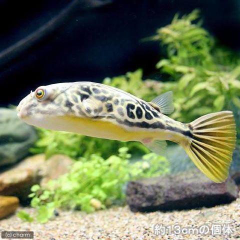 中央アフリカ、コンゴ川、タンガニィカ湖に生息するのフグの仲間です。 淡水フグの中では世界最大の種で成魚では70cm超えることもあります。 幼魚ではやや大柄なまだら模様ですが、成長とともに体側のラインは細かな唐草模様を見せ、美しい黄色の体色と尾ビレが魅力的な種です。 飼育は純淡水で問題ありませんが、大型になる種なので将来的には90~120cm水槽が必要になります。 餌は生餌を好み若魚ではエビや赤虫、成魚では小赤など、歯の伸びすぎを防ぐ為にも定期的にタニシやシジミなどの貝を食べさせると良いでしょう。 人工飼料はクリルに餌付かせることも可能です。 底砂に潜る習性があり、水草自体を齧ることから水草は入れない方が良いでしょう。 また力が強く、歯が鋭いのでヒーターなどは割られないように注意が必要です。 性格はフグの中でも特に荒く単独飼育が適しています。 |