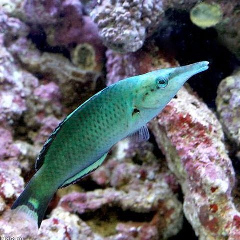 英名でバードラスと呼ばれている通り突出した吻部、胸ビレを使って泳ぎ回る仕草がまさに鳥のように見えるベラの一種です。 幼魚期は成魚と異なり吻部が突出しておらず、緑と白色をした可愛らしい姿です。 成魚はオスとメスとで体色が異なり、オスのほうが青緑色の綺麗な魚になります。 自然下では、突出した吻部で砂の中やサンゴの間に棲む微生物等を捕食しています。 |