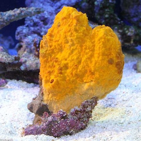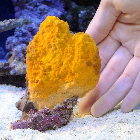 | 種類詳細 | オレンジ色をしたカイメンの一種で、この分類では比較的育てやすい種類です。 本種をはじめ、海綿(カイメン)とされる種類は、海水を含むことで水を浄化する能力をもっており、海水中の栄養分を吸収して成長します。 多細胞生物として位置づけられ、個体としては定義しづらい面がありますが、岩などに複数が寄せ集まって群生するように棲息します。 バリーションは様々で、筒状をはじめ、枝状、ウチワ状、杯(さかずき)状などが存在し、カラーバリエーションも豊富です。 |