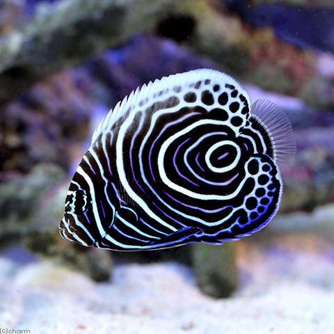 種類詳細 タテジマキンチャクダイの幼魚で、成魚は黄色と青の縦縞模様ですが幼魚のうちは青と白の渦巻き模様で、1年以上かけて徐々に成魚模様に変化していきます。