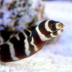 | 飼育のポイント | 肉食性ですので、基本的に単独飼育が望ましいです。 自然下では、岩場を複雑に組んだような場所の隙間に身を隠して獲物を狙いますので、ライブロックやかざりサンゴなでレイアウトを組んであげるとよいです。 また、立て泳ぎをすると、飼育水槽の高さ以上になることもありますので、フタなどで飛び出しに注意していただく必要があります。 |