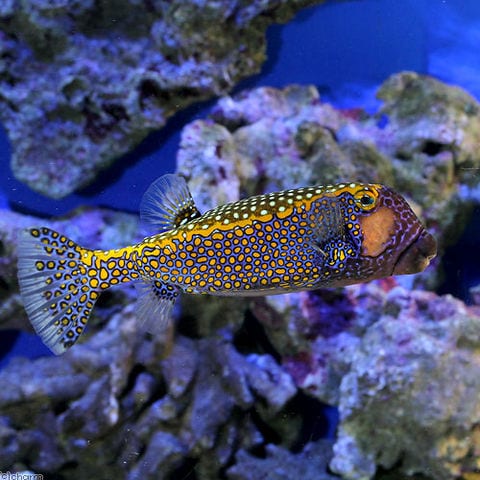 | 種類詳細 | 黒地に白のスポットが入るハコフグの一種でインド洋から太平洋にかけて分布しています。 小型の個体は全てがメスで、ある程度の大きさまで成長するとオスへと性転換します。 オスは全体的に青く染まり全く異なった美しい色彩をしています。 |