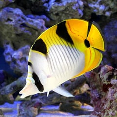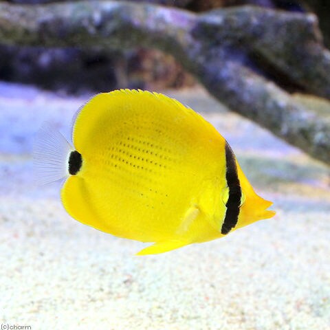 黄色い体色が多いチョウチョウウオの仲間の中でも一際鮮やかな体色をした美種です。 アミチョウチョウウオに似ていますが、本種は体側の柄が小さな黒色斑であることで見分けることが可能です。 成長すると頭部に薄っすらと青色になり、とても美しくなります。 個体数が少ないことから、流通量も少ないチョウチョウウオです。 |