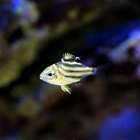 | 飼育のポイント | 自然下では水深の浅い磯の潮溜まりに群れをなして棲息しており、小型水槽での育成も可能ですが、成魚になるにつれ泳ぎまわりますので、60cm以上の水槽飼育がおすすめです。 人工飼料にも馴れやすいですが、肉食性の一面があるため、小型の魚やエビ、イソギンチャクなどとは、混泳を避けた方が良いです。 特に口に入るサイズのイソギンチャクはグビジンイソギンチャクなど刺胞毒の強い種類でさえも捕食してしまうのでご注意ください。 |