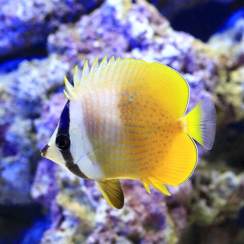 | 飼育のポイント | チョウチョウウオは白点病に罹りやすいので日常の水質管理に気をつけましょう。 テリトリー意識が強いので同種及び近縁種との混泳は避けたほうが無難です。 またサンゴのポリプを好んで食べますので、一緒に飼育しないほうが良いでしょう。 やや人工飼料に餌付きにくい個体が多いので、イサザアミ等の生餌から餌付けていくといいでしょう。 |
