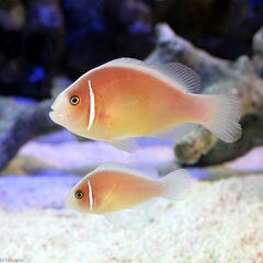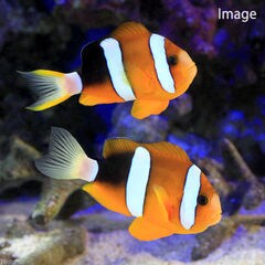 トマトの名前で親しまれているクマノミでタマイタダキ等のイソギンチャクと共生します。 色彩変異の多い種類で色の濃淡や黒班の入り方にバリエーションがあります。 雄性先熟型の性転換を行うので小さい個体がオス、大きくなった個体がメスになる性質を持っています。 飼育は容易で人工飼料もすぐに食べますが大きくなると攻撃性が強くなるので注意が必要です。 水槽内での繁殖も仔魚の初期餌料となるワムシを用意できれば比較的容易です。 |