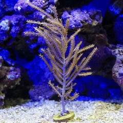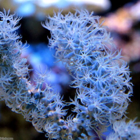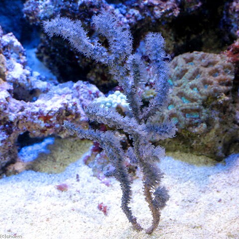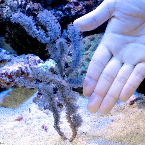 | 種類詳細 | 陰日性のヤギの仲間で、青色のボリュームのあるポリプを咲かせる大変美しいヤギです。 褐虫藻と共生しないため光は必要としませんが、冷凍コペポーダやサンゴ用フードなどの餌を与える必要があります。 日没後の時間帯以降からポリプが開きやすくなりますので、ポリプが開いているのを確認したら冷凍コペポーダやサンゴ用液体フードをこまめに吹きかけてあげましょう。 潮通しの良い場所に生息していますので強めの水流、また温度も低めを好みますのでクーラーの設置は必須です。 |