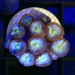 | 種類詳細 | イソギンチャクに近い種類のソフトコーラルで4~8mmのポリプが浅い海の岩の上にマット状の共肉でつながった大きな群体をつくります。 カラーバリエーションが豊富でグリーン、オレンジ、ピンク、レッドなどがありポリプの中心部に色が付いているものもあります。 丈夫ですのでサンゴ入門におすすめの種類で光・水流・水質ともに最低限の設備で飼育可能ですが環境を整えてあげると色はよく揚がり増殖するスピードも早くなります。 給餌は基本的に不要ですが与える場合は液体もしくは粉末状のものを週に1度程度吹きかけてあげると良いでしょう。 |