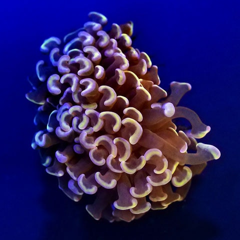 | 飼育のポイント | 少々クセのあるサンゴですが要点さえ抑えてしまえば育成はそれほど難しくありません。 水質は常に硝酸塩やリン酸塩など栄養塩類が極めて低い環境が適しています。 水流は強すぎると弱ってしまうので、触手が緩やかにたなびく程度にサンゴ全体にあたるような太い水流が適しています。 照明はそれほど強すぎず、ほどほどの光量が適しており特にブルー系のランプを多めに使用すると本種の美しさが際たちます。 ハードコーラルのなかでも特に刺胞毒が強く、至近距離に他種のサンゴがあると スイーパー触手という攻撃用の触手を伸ばし駄目にしてしまうため、配置には特に注意が必要です。 ただし、同属であるハナサンゴの仲間に限り触れ合っても大丈夫です。 |