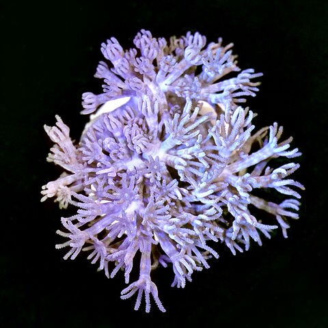 小さな花のようなポリプが美しいソフトコーラルで、水流に当たるとゆらゆらと揺れる姿が楽しめます。 照明は青色の波長を含む温白色主体の照明がポリプを広げやすく、リン酸塩0.08~1.12ppm、硝酸塩5~10ppm程度の適度な栄養塩がある環境を好みます。 水流は適度にポリプが動く程度が良く、冷凍や粉状のサンゴフードを定期的に給餌することでより状態よく成長させることができます。 |