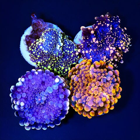 | 種類詳細 | イソギンチャクに近いソフトコーラルの仲間で、通常のディスクコーラルとは異なり触手の先端が膨らむのが特徴です。 カラーもブルー、レッド、グリーンのほか色が混じったマーブル、ストライプなど多彩なバリエーションがありコレクション性の高いサンゴです。 飼育に関しては光、水流、水質などは最低限の環境で飼育が可能なので初心者にもおすすめと言えますが、色揚げなど状態良く飼育するにはライトの色や硝酸塩の蓄積などに気を配ってあげる必要があります。 給餌に関しては光合成に依存している率が高いので基本的には不要ですが与える場合は月に2~3回、ふやかしたクリルを与える程度で十分です。 また他のサンゴと比べると毒性はやや強いので他の種類とレイアウトする際は近すぎないように配置しましょう。 |