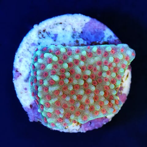 オーストラリア産の赤いポリプを持つ美しいコモンサンゴです。 環境によりライトグリーンにレッドのポリプが映えるコレクション性の高い発色をしています。 栄養塩が完全に枯渇した環境や強光障害で色落ちしてしまう場合があるため注意が必要です。 |