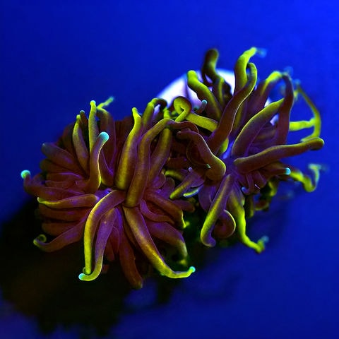 水流は強すぎず弱すぎず、ポリプが自然に揺れる程度を維持してください。 照明はブルー系LEDを主体に、複数灯で光量を確保することが望ましいです。白色系のみの強光は避けてください。 KH(7~9dKH)、カルシウム、マグネシウム、ストロンチウム、ヨウ素、アミノ酸などの微量元素を定期的に補給することで健全な成長を促します。 ポリプの開きが良くない場合、光量や水流を見直し、アミノ酸や微量元素の添加を行うと改善することがあります。 刺胞毒はやや強めで、他種のサンゴに触れるとダメージを与えるため、配置には十分注意してください。同属のハナサンゴ類とは接触可能です。 |