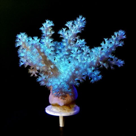 本種は、柔らかな樹枝状のシルエットと大きめのポリプを特徴とするソフトコーラルの一種です。 ライトグリーンの蛍光を帯びたポリプは青系LED照明下で特に映え、水景に自然で明るい色彩を与えてくれます。 成長は比較的穏やかで、レイアウトのアクセントとしても非常に優秀です。 また、照明と水流さえしっかり整えれば飼育がしやすく、初めてソフトコーラルに挑戦される方にもおすすめできる種類です。 ポリプの動きは水流に合わせてゆったり揺らぎ、自然な海中の雰囲気を演出する魅力があります。 |