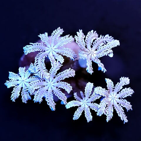花のようなポリプを持つ人気のソフトコーラルで、グリーン、オレンジ、ホワイトなど様々な色彩を楽しめます。 照明は青色の波長を含む温白色主体の照明がポリプを広げやすく、リン酸塩0.08~1.12ppm、硝酸塩5~10ppm程度の適度な栄養塩がある環境を好みます。 水流は適度にポリプが動く程度が良く、冷凍や粉状のサンゴフードを定期的に給餌することでより状態よく成長させることができます。 |