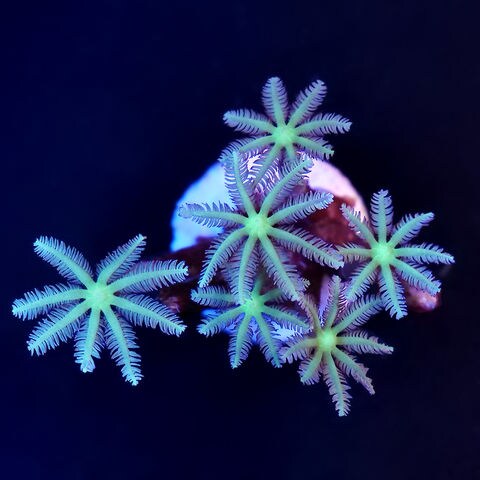 花のようなポリプを持つ人気のソフトコーラルで、グリーン、オレンジ、ホワイトなど様々な色彩を楽しめます。 照明は青色の波長を含む温白色主体の照明がポリプを広げやすく、リン酸塩0.08~1.12ppm、硝酸塩5~10ppm程度の適度な栄養塩がある環境を好みます。 水流は適度にポリプが動く程度が良く、冷凍や粉状のサンゴフードを定期的に給餌することでより状態よく成長させることができます。 |