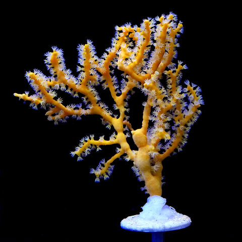 繊細に枝分かれした姿が大変美しい陰日性イソバナのイエロータイプです。 飼育には強めの水流、できるだけ高頻度の給餌が必要なサンゴで、サンゴ用の液体または粉状フードや冷凍ワムシ等を定期的に給餌することがおすすめですが水質悪化の元になりますので与えすぎには注意してください。 色彩は種類によってレッド、オレンジ、イエロー、など様々なカラーが存在し、ポリプを開くと実に美しく見えます。 縦に長く成長する種類が多いため、レイアウトでは高さのある水槽で配置すると深場の環境を演出することができます。 |