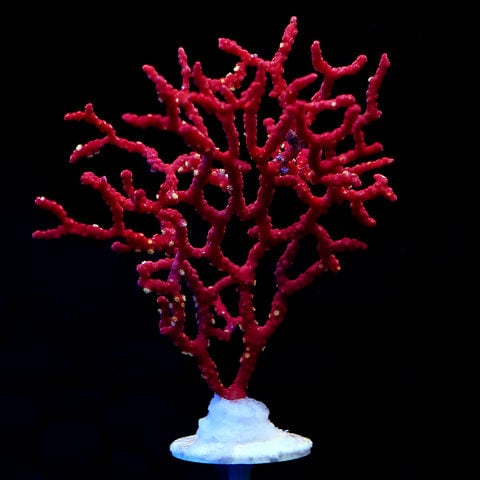 繊細に枝分かれした姿が大変美しい陰日性イソバナのレッドタイプです。 飼育には強めの水流、できるだけ高頻度の給餌が必要なサンゴで、サンゴ用の液体または粉状フードや冷凍ワムシ等を定期的に給餌することがおすすめですが水質悪化の元になりますので与えすぎには注意してください。 色彩は種類によってレッド、オレンジ、イエロー、など様々なカラーが存在し、ポリプを開くと実に美しく見えます。 縦に長く成長する種類が多いため、レイアウトでは高さのある水槽で配置すると深場の環境を演出することができます。 |