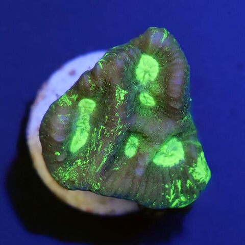 種類詳細 深緑色の共肉をベースに内輪のマウスや外輪にマーブル状の蛍光グリーンをあしらったキクメイシの仲間です。