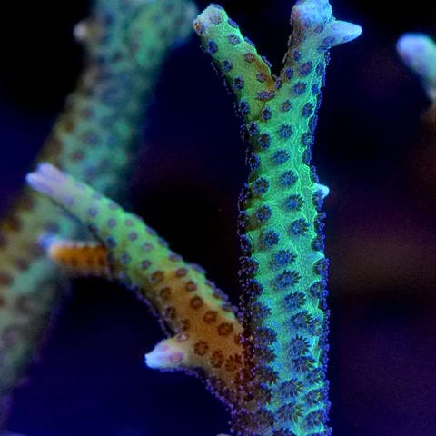 ハナヤサイサンゴ科トゲサンゴ属で、トゲサンゴに似るが枝は比して太くなり、5mm~9mmくらいになるのが特徴的です。 環境が悪いと骨格からポリプが抜け出し別の場所で繁殖を始めることもあります。色はグリーン、ベージュ、イエロー、ピンクなどが多く知られています。 ミドリイシよりも難しいとも言われるサンゴです。 |