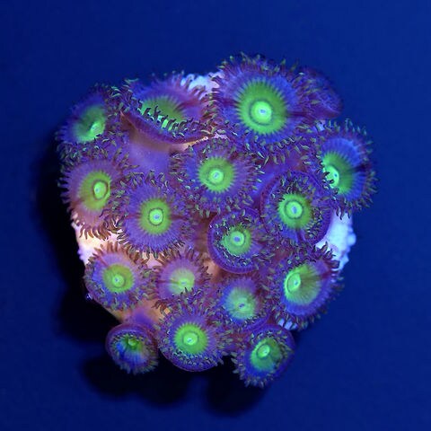 | 種類詳細 | イソギンチャクに近い種類のソフトコーラルで4~8mmのポリプが浅い海の岩の上にマット状の共肉でつながった大きな群体をつくります。 カラーバリエーションが豊富でグリーン、オレンジ、ピンク、レッドなどがありポリプの中心部に色が付いているものもあります。 丈夫ですのでサンゴ入門におすすめの種類で光・水流・水質ともに最低限の設備で飼育可能ですが環境を整えてあげると色はよく揚がり増殖するスピードも早くなります。 給餌は基本的に不要ですが与える場合は液体もしくは粉末状のものを週に1度程度吹きかけてあげると良いでしょう。 |