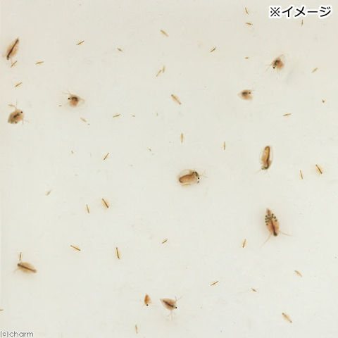 | 保存方法 | 水量に適した鶏糞をお茶パック等に入れ容器に弱いエアレーションし、温度を10℃~20℃の間に保ちます。 ミジンコの餌として定期的にグリーンウォーターや少量の鶏糞を与えてください。 オオミジンコは高温に弱いので30℃を超えないように注意してください。 環境が悪くなる休眠卵を作り、数ヶ月は孵化しないことがあります。 また過密になると死亡率が高くなりますので、増えすぎた場合間引きが必要です。 |