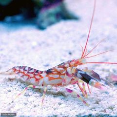 | 種類詳細 | イソギンチャクまたはサンゴ類に共生するエビの一種でクリーナーシュリンプとしても働きます。 両方のハサミを前で合わせ左右に振る動作をするため、踊っているように見える事で有名です。 踊っている様な仕草は自分がクリーナーシュリンプである事のアピールだと言われています。 小型なためサンゴやイソギンチャク等と一緒に飼育し、定位置を確保してあげる事をお勧めいたします。 |