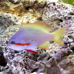 | 種類詳細 | 非常に綺麗な体色をしたハナダイの仲間です。 性転換する魚で、オスになると名前の由来である赤帯がくっきりと目立ち非常に綺麗なハナダイです。 幼魚期も薄いオレンジ色の体に、ほんのりピンク色のヒレが可愛らしい魚です。 他のハナダイに比べて、色落ちも少なくオススメです。 |