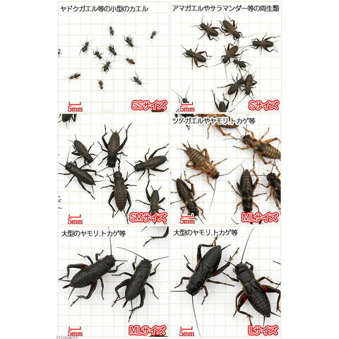 | 商品サイズ | ※…各サイズ入荷ロットにより大きさが若干異なる為、グラムあたりの匹数には変動があります。予めご了承ください。 Lサイズ(約2.5cm~羽のあるサイズ) 10gあたり約10匹程度 ・蒸れでの死着防止の為、紙袋及び段ボールでの梱包とさせていただきます。 MLサイズ(約1.7~2.3cm) 10gあたり約15匹程度 ・蒸れでの死着防止の為、紙袋及び段ボールでの梱包とさせていただきます。 SMサイズ(約0.8~1.6cm) 10gあたり約50匹程度 ・蒸れでの死着防止の為、プリンカップ、または紙袋及び段ボールでの梱包とさせていただきます。 |