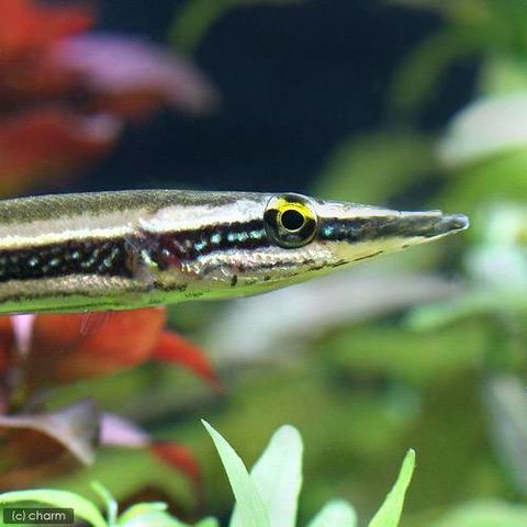 同じ仲間のグラミーやベタとは全く異なる独特の風貌が面白い種で、枯れ枝に擬態したようなスレンダーな体型と、大きな眼と頭部を持ちます。 特にジャバラ状に伸びる大きな口は小魚等を捕らえるのに適し、近くに寄ってくる小魚を待ち伏せて捕らえる姿は野性味が溢れ魅力的です。 本種は通常のクロコダイル・フィッシュとは異なり、体側に美しいブルースポットを持ちます。 以前から通常のクロコダイル・フィッシュとは別種とされていましたが、2005年になってようやく別種として記載されました。 飼育はスレに弱く、導入時には注意が必要です。エサは人工飼料に餌付きづらく、小魚などの生餌を中心に与える必要があります。 |
