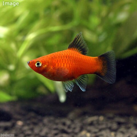 古くから知られるプラティを代表する品種です。赤い体色に黒いヒレがアクセントになり、水槽内でも良く目立ちます。