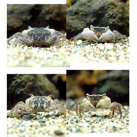 | 種類詳細 | 太平洋沿岸原産のカニです。 白いハサミと背部の黒い模様が美しい種で、その模様からバティック(ろう染め)と呼ばれています。 その色彩はバリエーションも多く、背部や脚部がやや赤味を帯びた個体も見られ、背部がグリーンに染まるタイプや、背部の黒い模様が少なく赤味の強いタイプなどの色彩変異タイプも見られます。 主に海岸などの転石地に生息地し、日本国内でも南西諸島の海岸部に極僅かに見られます。 飼育は容易で、水中で脱皮をするため、体が全て水に浸かる程度の水場を用意したテラリウムで飼育可能す。 純淡水でも飼育可能ですが、海水もしくは汽水を使用したほうが良いでしょう。エサは人工飼料で問題ありません。 十分に隠れ家を用意し、過密になるとケンカをするので注意が必要です。 遊泳している魚を捕食することはあまりありませんが、単独飼育が理想的でしょう。 |