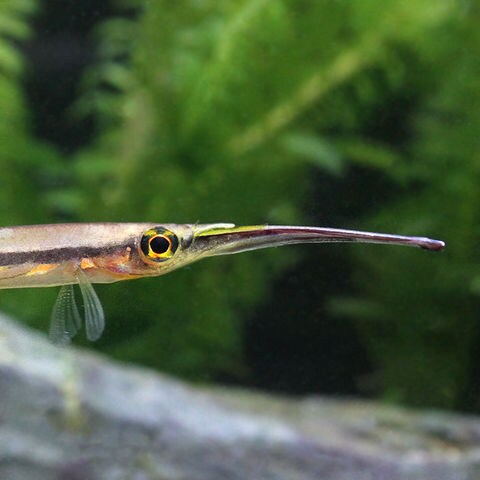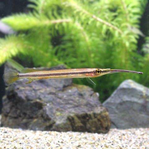 | 種類詳細 | ボルネオ原産のサヨリの仲間です。 細長い体と長い口が特徴的なハーフビーク、ヘミランフォドンの中でも輸入が少なく、体側に入る光沢のスポットがとても美しい種です。 tengahのインボイスで輸入されるものとは別種となり、本種もゴールドスポットハーフビークの名で流通します。 tengah種よりも大きくなると言われ、水槽に一度馴染むと非常に丈夫で、飼育も容易です。 水面付近を泳ぐことから浮上性のエサが適しています。 |
