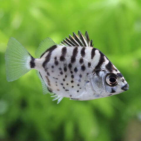 | 種類詳細 | 東南アジア原産のクロホシマンジュウダイの仲間です。 緑のかかった銀色の体色が非常に美しく、体側に7~12本の線と斑点があります。 飼育は容易で、人工飼料にも餌付きやすいです。 |