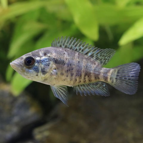 | 繁殖 | 幼魚、若魚では判別が困難なため繁殖を狙う場合は複数匹飼育し、自然形成されたペアを得る必要があります。出来上がったペアは一緒に行動し、他魚を追い払いテリトリーを主張するようになります。底砂の窪みや平らな石の上に産卵し、ペアで子育てをするオープンスポナーです。混泳魚がいる場合は隔離する必要があります。稚魚はブラインシュリンプを与えるとよいでしょう。 |