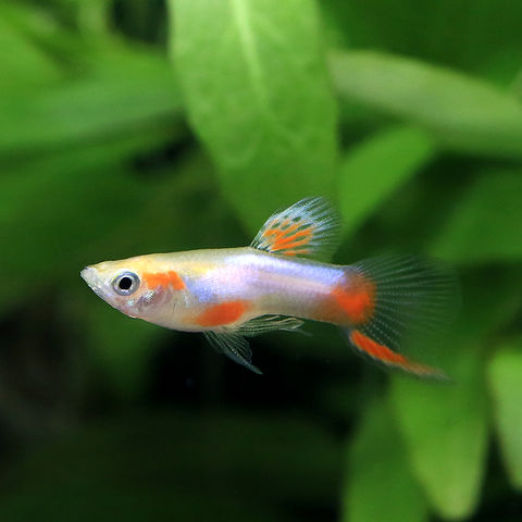 | 繁殖 | グッピーと同様に繁殖力が強く、卵ではなく稚魚を生む卵胎生です。オスは尻ビレが細長くなった交接器(ゴノポディウム)を持ち、交尾をして1ヶ月程たち、メスのお腹が膨れて尻ビレ付近の黒い斑点が目立ってきたら出産が近いです。初産では産仔数は少なく、出産の回数を重ねた大きなメスはたくさんの仔を産みます。1度の交尾でメスは数回子供を生むことができます。 生まれたばかりの稚魚は、他魚や親魚に食べられてしまので産卵ケースを使用したり、水草を多めに植え込む必要があります。メスの動きがせわしくなったり、水槽の下のほうでボーっとしたりという行動が目立ってきたら産卵ケースなどに入れて出産に備えてください。 グッピーに比べ仔を食べてしまうことは少ないです。 稚魚はすぐに細かな人工飼料を食べられます。餌の与えすぎによる水質の悪化、少なすぎによる痩せに注意して、少量の餌を1日に数度与えます。1ヶ月程度でオス、メスの区別がつくようになり、3ヶ月以上たった若魚は交配させることができます。 累代をしていくと鮮やかな体色が失われやすいので、親魚の選択が重要です。 |