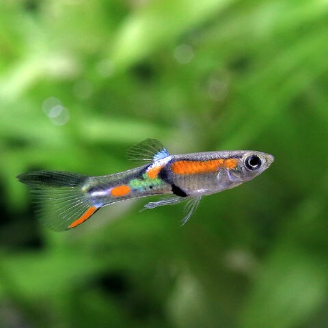 その鮮やかな色彩は非常に多くのパターンが知られ、コレクション性も十分といえるでしょう。 本タイプは2011年に採集されたカンポマ産のタイプの一つで、ティグレ川で採集されたと言われています。 鮮やかなグリーンからブルーの発色、黒いスポットとトップソードが特徴的で、他のエンドラーズに比べると精悍な雰囲気を持ちます。 各タイプごとに系統維持されており、鮮やかな体色は水草水槽に良く映え群泳させると非常に美しいです。飼育は普通のグッピーと同様で問題なく、低いpHへの適応力はグッピーより高いです。 |