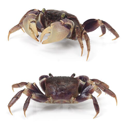 | 種類詳細 | 太平洋沿岸に広く生息するカニです。 ベンケイガニやアカテガニなどに近縁な陸棲のカニで、シロツメアシハラガニモドキの名で南西諸島からも知られています。 大きくがっちりした体と先端が白い大きなハサミが特徴的で、背部には微毛が並びます。 主にマングローブの生えた水辺に生息し、陸棲の傾向が強く、植物質のエサを好むようです。 飼育は容易で、水中で脱皮をするため、体が全て水に浸かる程度の水場を用意したテラリウムで飼育可能です。 純淡水でも飼育可能ですが、海水もしくは汽水を使用したほうが良いでしょう。エサは人工飼料で問題ありません。 十分に隠れ家を用意し、過密になるとケンカをするので注意が必要です。 遊泳している魚を捕食することはあまりありませんが、単独飼育が理想的でしょう。 |