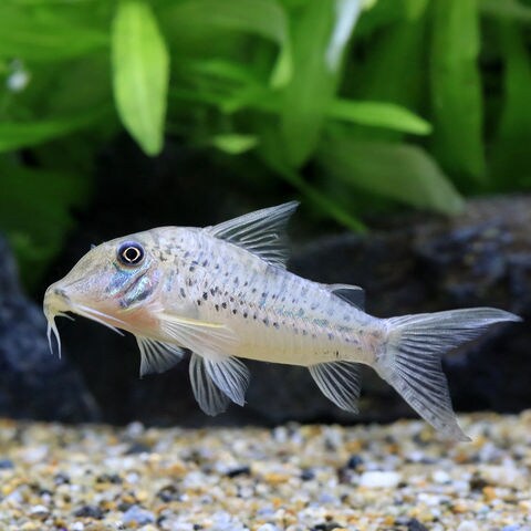 | 種類詳細 | ブラジル、ロンドニア州原産のロングノーズのコリドラスです。 細かいスポット模様と、背びれの付け根付近に黒点を持つのが特徴です。 よく似た種類のクリスチーナには背びれにも黒点が入りますが本種には入らず、体側のジャンクションラインも不明瞭になるため、その点で見分けることが可能です。 飼育は容易で、混泳にも適した種です。 |