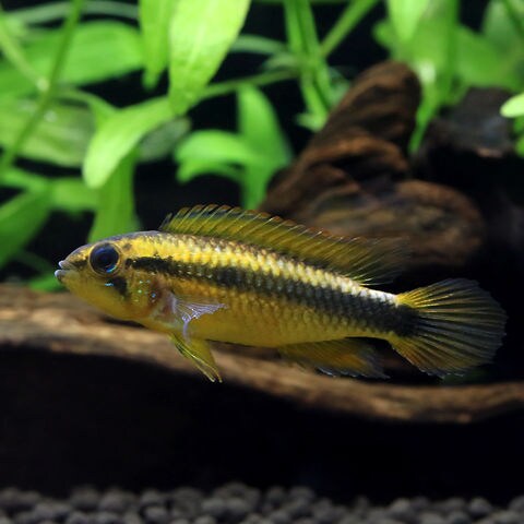 | 繁殖 | 流木やシェルターなどの陰に産卵するケーブスポウナーです。 発情したメスは体色全体が黄色く色づき、オスメス共にテリトリーを主張するようになります。 ペアが十分に発情していれば、シェルターなどに産卵をしメスが卵を孵化まで保護します。 産卵前は発情したオスに追いかけられるメスが、産卵後は卵を保護するメスに追いかけられるオスがボロボロにされることがあるので必要に応じて隔離をする必要があります。 また混泳魚も追い回されることがあります。卵が孵化し稚魚が自由遊泳後しばらくはメス親が稚魚を保護します。 自由遊泳を開始した稚魚は孵化したてのブラインを食べることが出来、この頃には親魚は別の水槽に移した方が良いでしょう。 |