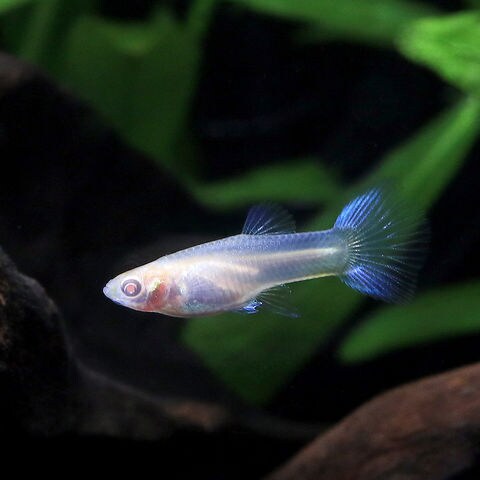 | 繁殖 | グッピーは非常に繁殖力が強く、卵ではなく稚魚を生む卵胎生です。オスは尾ビレが細長くなった交接器(ゴノポディウム)を持ち、メスは交尾後1ヶ月程で仔魚を生みます。 メスのお腹が膨らみ、尾ビレ付近の黒い部分が目立ってきたら出産が近いです。初産では産仔数は少なく、大きなメスは100匹近く仔魚を産み、1度の交尾で数回仔魚を産むことができます。 メスがせわしく泳いだり、水槽の下でボーッとする行動が見られたら、稚魚が他魚や親魚に食べられないように産卵ケースや別水槽に移動してください。 グッピーの稚魚はすぐに細かな人工飼料を食べられます。餌の与えすぎによる水槽の悪化に注意して、少量の餌を1日に数度与えます。1ヶ月程度でオスメスが判別でき、3ヶ月程で交配可能です。 |