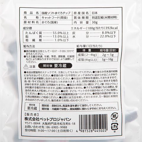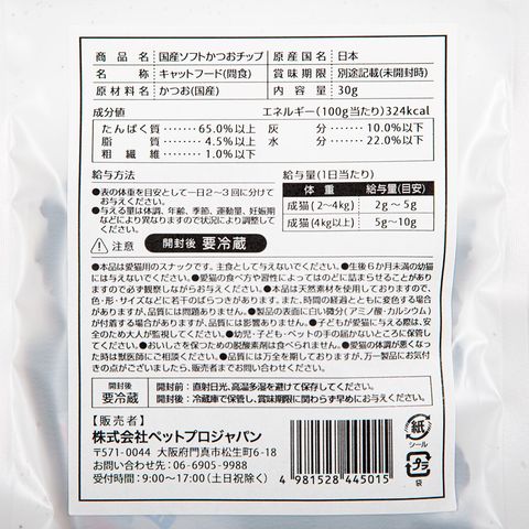 | 保証成分 | 【国産ソフト かつおチップ】 たんぱく質:65.0%以上、脂質:4.5%以上、粗繊維:1.0%以下、灰分:10.0%以下、水分:22.0%以下 【国産ソフト まぐろチップ】 たんぱく質:55.0%以上、脂質:13.0%以上、粗繊維:1.0%以下、灰分:8.0%以下、水分:22.0%以下 |