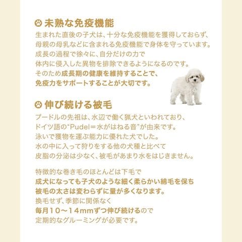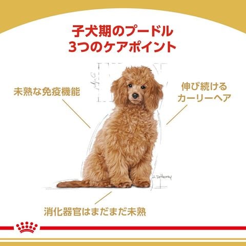 | 特徴 | ●ブリード ヘルス ニュートリションは犬種ごとの気をつけたいポイントに配慮し、それぞれの栄養要求を満たす特定犬種のための総合栄養食です。 ●<プードル 子犬用>は、ビタミンEを含む、独自の抗酸化成分の配合が健康を維持することで、子犬本来の抵抗力を維持します。 ●健康なプードルの柔らかい被毛と健康な皮膚を維持するために、ルリチシャ油やオメガ3系不飽和脂肪酸(EPA・DHA)を配合しました。また、伸び続ける被毛の健康な成長を促すために最適なタンパク質量に設計されています。 ●消化性の高いタンパク質(L.I.P.*)とプレバイオティックス(フラクトオリゴ糖)の組み合わせが、健康的な消化を維持するとともに、腸内細菌バランスを整え、健康的な糞便の状態を維持します。 *L.I.P.:消化率90%以上の超高消化性タンパク(ロイヤルカナン調べ) ●成長期のプードルがしっかりと噛めるように設計された、最適な大きさ、形、食感のキブル(粒)です。よく噛むことにより歯垢・歯石の蓄積を抑える手助けをします。 |