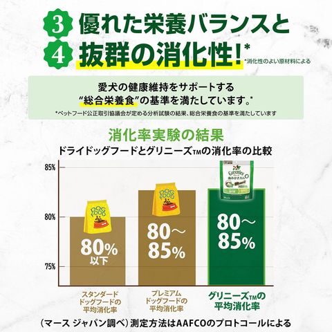 | ご注意 | ※本品は生後6ヶ月以上の超小型犬用です。対象の犬以外には与えないでください。 ※愛犬にグリニーズを与える場合は、必ず愛犬の体重に適したサイズを選んでください。 ※愛犬の食べ方や習性によっては、のどに詰まらせることがありますので目の届くところで与えてください。 |