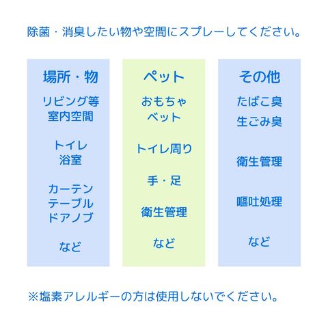 ペットのトイレ周りや用品、キッチン周りやテーブル床などの身の回りのものの除菌・消臭にご利用ください。