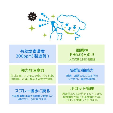 ●本品は次亜塩素酸ナトリウム・希塩酸(いずれも食品添加物指定品)・水を混合することで希釈・精製された微酸性次亜塩素酸溶液を使用した弱酸性除菌消臭水です。 ●ペットのトイレ周りや用品、キッチン周りやテーブル床など身の回りのものの除菌・消臭にご利用ください。 ●人やペットの肌と同じ弱酸性(微酸性)です。 ●消臭・除菌したい物などに噴霧してください。雑菌・細菌の気になる場所などにおすすめです。 ●生ゴミやアンモニアなどの悪臭に対して抜群の消臭効果を発揮します。 ●有効塩素濃度200ppm、pH6.0(プラスマイナス0.3)の弱酸性です。 ●菌に触れたり、有機物に触れると水に戻ります。 ●小ロットで精製・出荷管理し、作り立てをお届けします。 ●キャップ付なので何度かに分けて使用することができます。 |